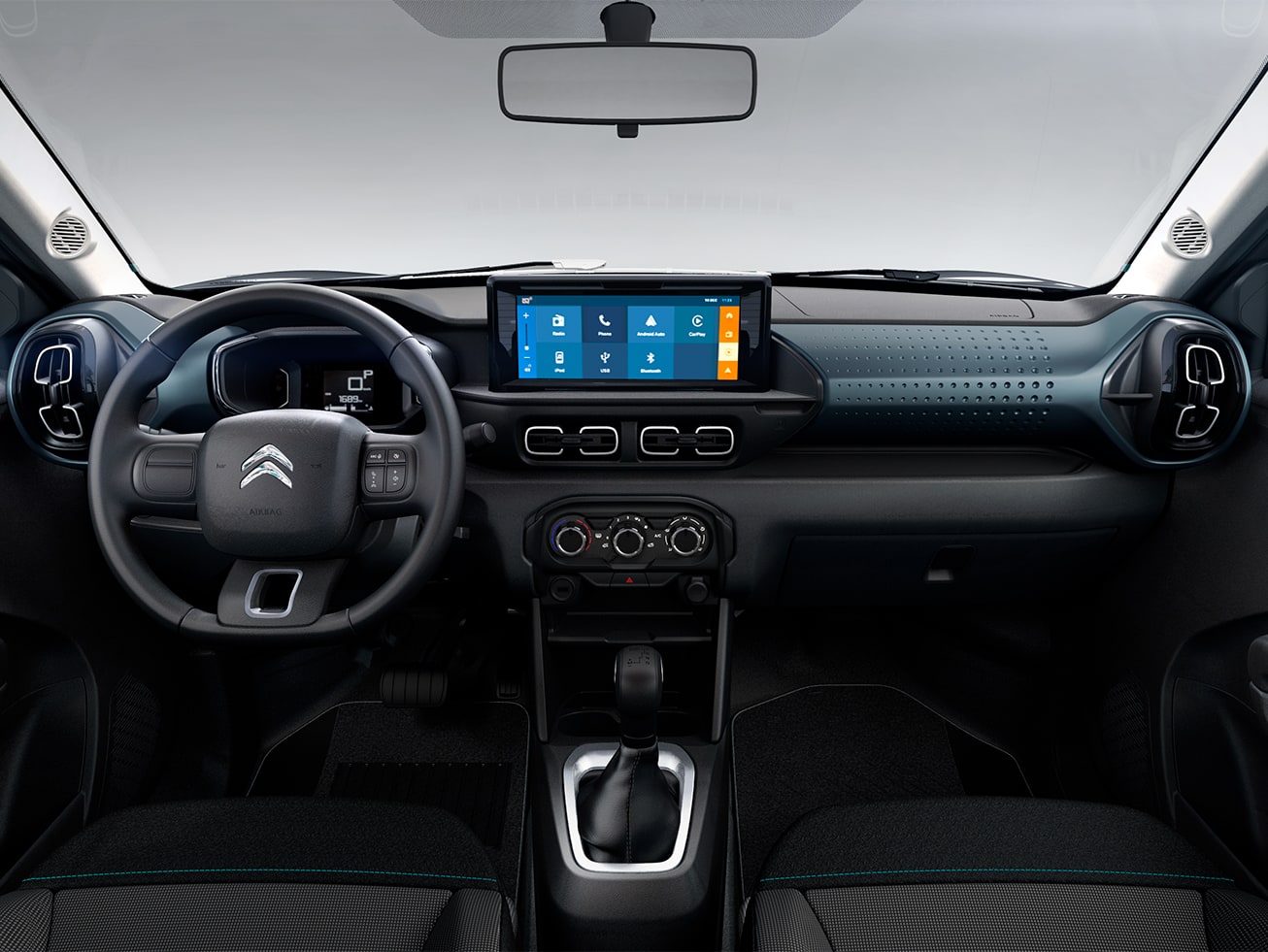 EQUIPAMIENTOS: El C3 Live 1.2 ofrece de serie: doble airbag delanteros frontales, frenos ABS+REF, asistente de arranque en pendientes (Hill Assist), controles de tracción (ASR) y estabilidad (ESC), cinco apoyacabezas, cinco cinturones de seguridad inerciales, anclajes ISOFIX y TopTether para sillas infantiles, pack eléctrico (dos levantavidrios y bloqueo), radio AM/FM/Bluetooth, luces diurnas halógenas, respaldo trasero rebatible enterizo, dirección asistida eléctricamente, indicador de cambios (GSI), instrumental digital con computadora de a bordo y pantalla TFT de 3,5 pulgadas, tapizados en tela «Rubic/Nimbus», tiradores de puertas en color negro, parrilla con chevrones en color gris, espejos exteriores en color negro brillante, aire acondicionado, y llantas de acero estampado con tazas plásticas de 15 pulgadas sobre neumáticos en medida 195/65 R15.